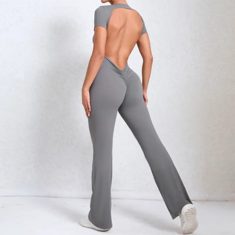 HomePRODUCTSJumpsuitShort Sleeve Backless Tummy Control Flared Workout Jumpsuit